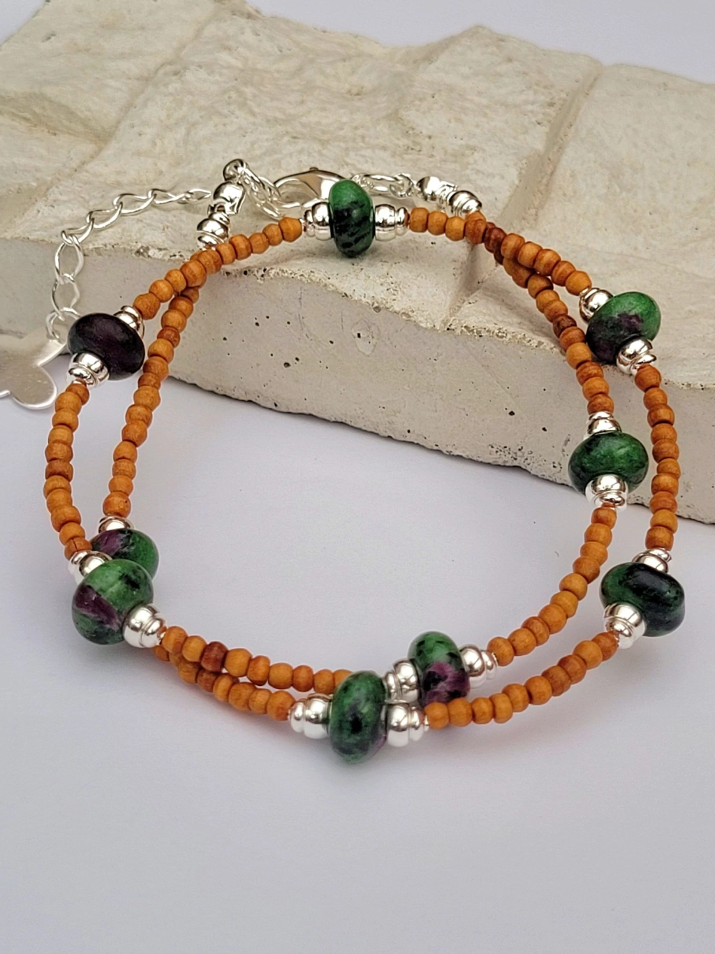 Aposte em um acessório que faz a diferença. Adquira o seu colar de Sândalo e Pedras Naturais de Rubi Zoisita e sinta a harmonia e a beleza que ele traz para a sua vida!