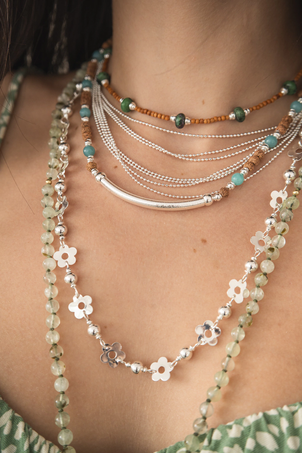 Este encantador colar da Coleção Flower é uma expressão perfeita da natureza e da beleza moderna. Confeccionado com contas de sândalo e pedras naturais, ele combina a elegância de detalhes banhados a prata com um toque jovem e contemporâneo.